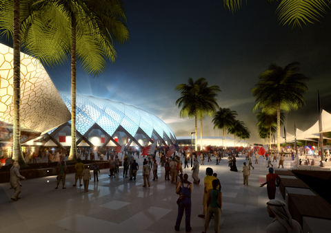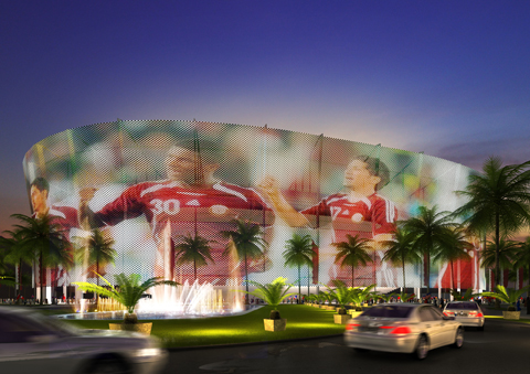 A 44,000+ seat capacity design with a special “media facade” membrane that acts as a screen for projecting news, updates and current matches. The stadium is to be expanded from its current 21,000+ capacity to achieve the desired capacity but will be downsized after the tournament.
